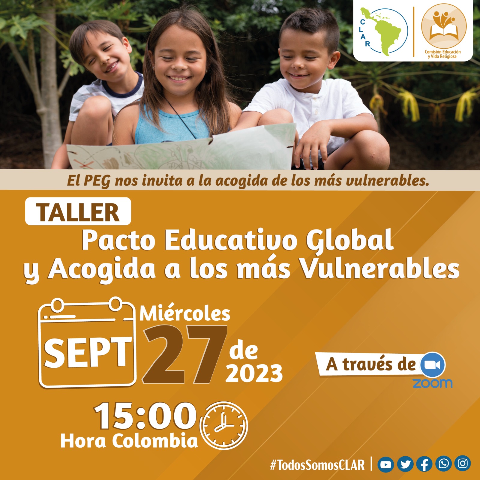 Con el objetivo de promover la reflexión que apuesta a una educación humanizadora desde el compromiso de educar y educarnos acogiendo la invitación del Pacto Educativo Global de abrirnos a los más vulnerables y marginados, la Comisión de Educación y Vida Religiosa de la CLAR, Confederación Latinoamericana de Religiosos, invita a participar en el Taller Pacto Educativo Global y Acogida a los más Vulnerables, que se realizará el próximo miércoles 27 de septiembre a las 15:00hrs (Colombia).