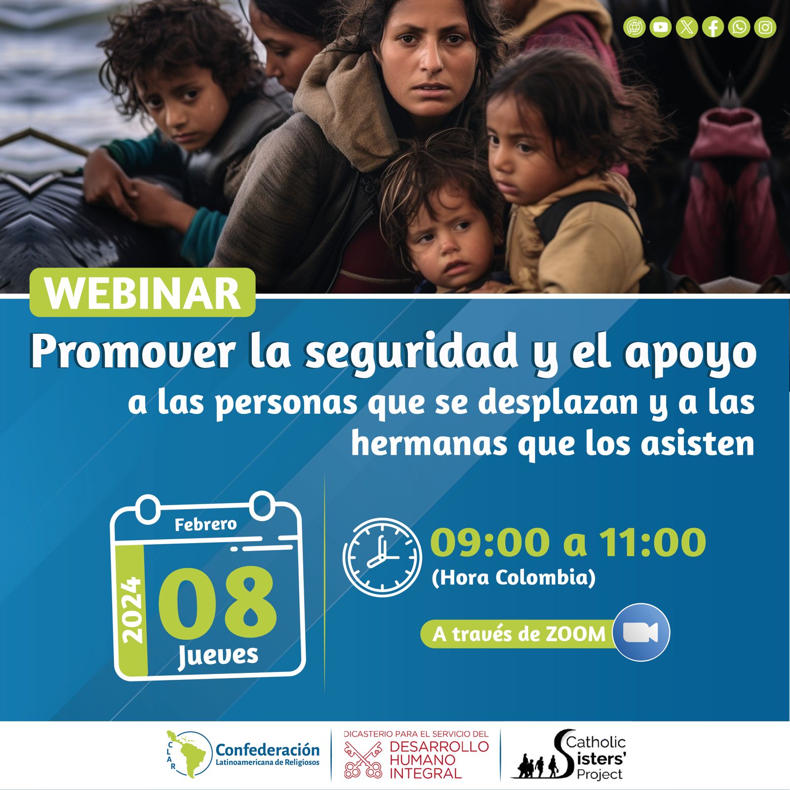 Desde la CLAR – Confederación Latinoamericana de Religiosos, invitamos a la Vida Religiosa Femenina que peregrina en América Latina y el Caribe, a participar en el Webinar Regional Latinoamericano “Promover la seguridad y el apoyo a las personas que se desplazan y a las hermanas que los asisten”, que se realizará el próximo Jueves 8 de febrero.