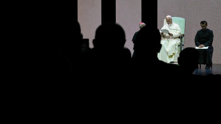 Momentos de espontaneidad caracterizan la última parte del encuentro, con un sacerdote español desde la primera fila preguntando al Papa si podía saludarlo en el escenario. Y León, con una sonrisa, responde: «¡Si tú lo haces, todos quieren hacerlo!». El Pontífice se dirige entonces a los sacerdotes del público, preguntándoles de dónde vienen: «¿Cuántos de África? ¿Cuántos de Asia?». Entre aplausos y gritos, el sacerdote español sube al escenario y le dice a León XIV que fue nombrado hace 23 años por Juan Pablo II. Le entrega dos zucchettos blancos, pidiéndole que los bendiga y los use. El Papa ríe, acepta la petición y baja de la pequeña plataforma para darle un cálido abrazo. Finalmente, unas palabras improvisadas, antes de la bendición final, le piden que compartamos un momento de oración.