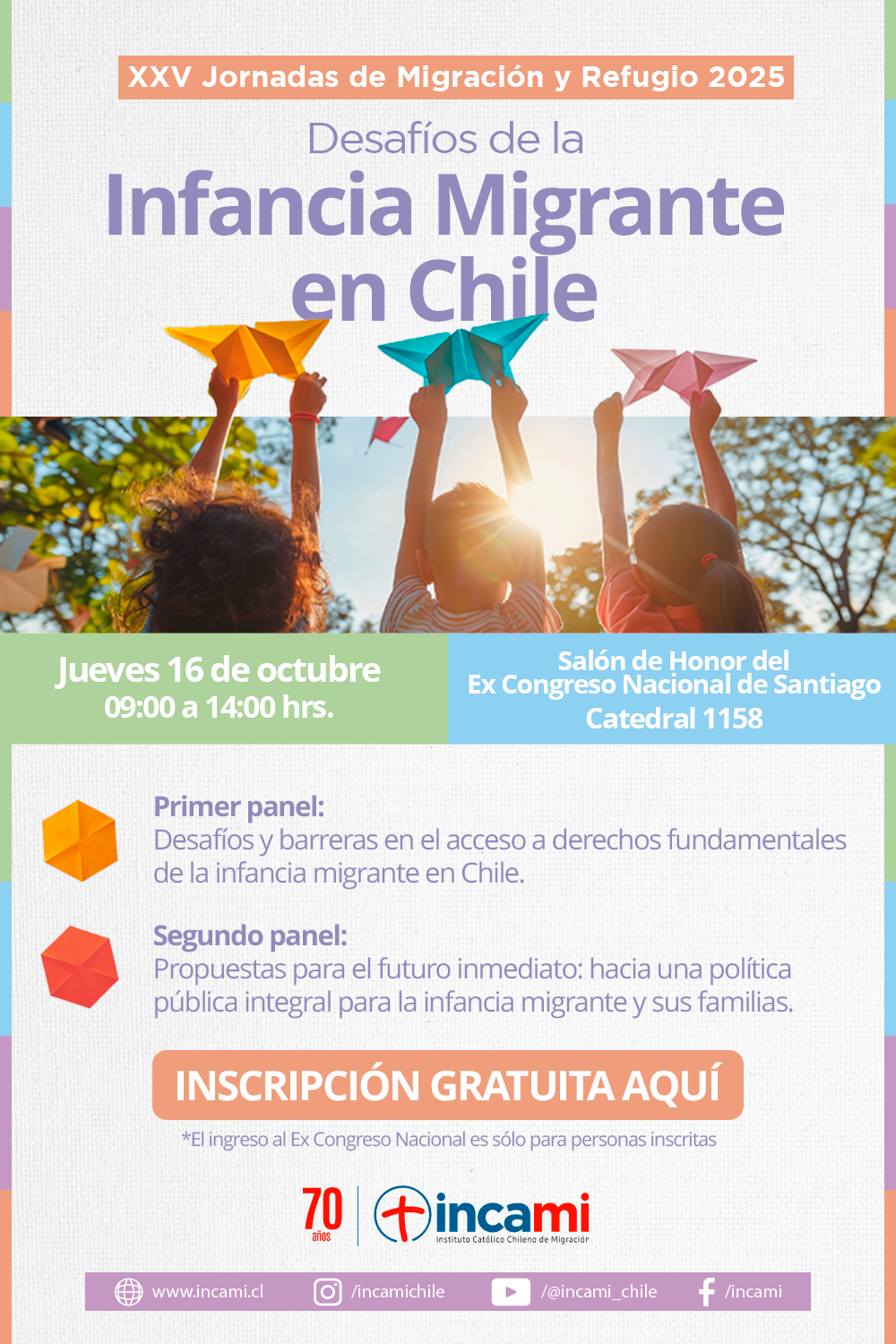 En su versión número 25 y en el marco del aniversario número 70 de INCAMI, esta nueva versión de las jornadas reunirá a expertos en niñez y migración de organismos internacionales, sociedad civil e instituciones del Estado, para dialogar y proponer soluciones concretas que mejoren la vida de niños, niñas y adolescentes migrantes en Chile.